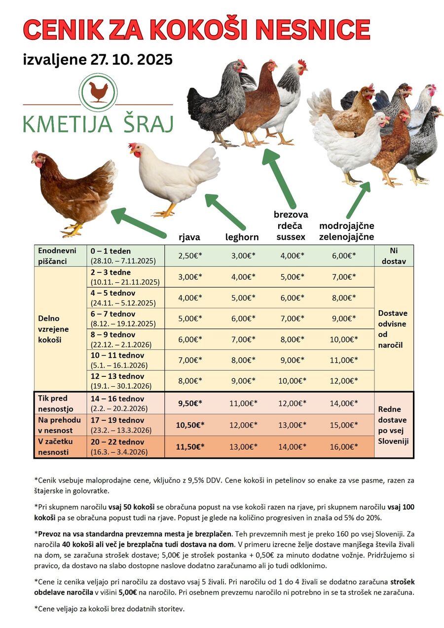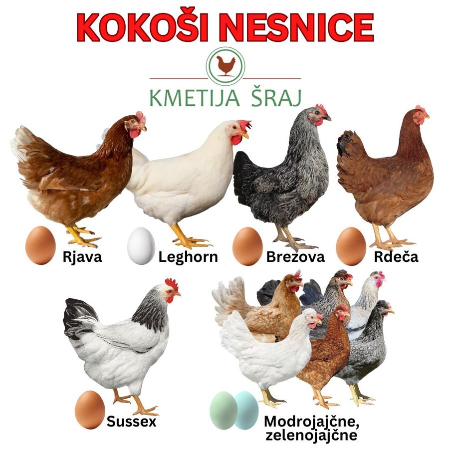 Na Kmetiji Šraj imamo na prodaj kokoši nesnice: rjave, leghorn bele, brezove, rdeče, sussex in zelenojajčne/modrojajčne. Naše kokoši so zelo trpežne in primerne za rejo v zelo raznolikih okoljih. Imajo dobro sposobnost prilagoditi se različnim pogojem. Izvaljene so bile 27.10.2025 in bodo z nesnostjo začele konec februarja / začetek marca. Cena za rjave je od 9,50€ do 11,50€, odvisno od starosti, ostale pasme so nekoliko dražje.Kot običajno je možna dostava po vsej Sloveniji. V večini primerov se za majhna naročila dobimo na skupnem prevzemnem mestu v vaši bližini, večje število pripreljemo brezplačno na dom. Za dostavo nas pokličite ali pišite na email. Zapisali bomo vaše naročilo, nato pa vam pošljemo SMS sporočilo nekaj dni pred dostavo.V decembru ali januarju lahko pri nas po predhodnem dogovoru osebno že prevzamete delno vzrejene kokoši, osebni prevzem odraslih kokoši pa bo potekal od 2.2.2026 naprej, in sicer na lokaciji KMETIJA ŠRAJ - hlev Poljčane (v Google zemljevidih). Termini za osebni prevzem v februarju so od ponedeljka do četrtka od 16:00 do 18:00.Za naročila in podrobnejše informacije smo vam na voljo na 031 751 675 in narocila@kmetija-sraj.si.