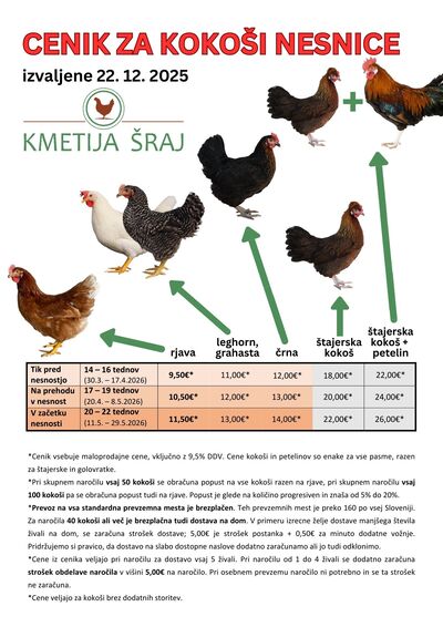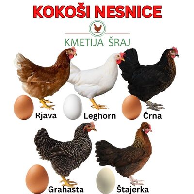 Na Kmetiji Šraj imamo na prodaj kokoši nesnice: rjave in leghorn bele. Naše kokoši so zelo trpežne in primerne za rejo v zelo raznolikih okoljih. Imajo dobro sposobnost prilagoditi se različnim pogojem. Izvaljene so bile 22.12.2025 in bodo z nesnostjo začele v začetku maja. Cena za rjave je od 9,50€ do 11,50€ in za leghorn 11€ do 13€, odvisno od starosti.